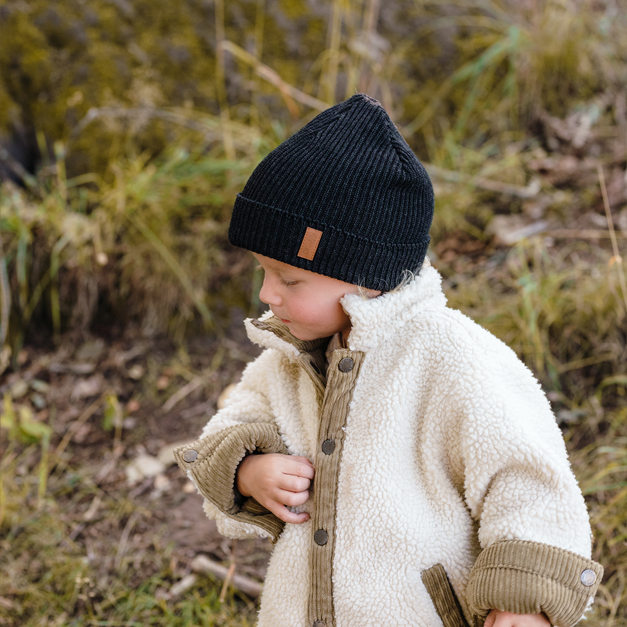Die Mütze besteht aus 50% Wolle und 50% Polyester.