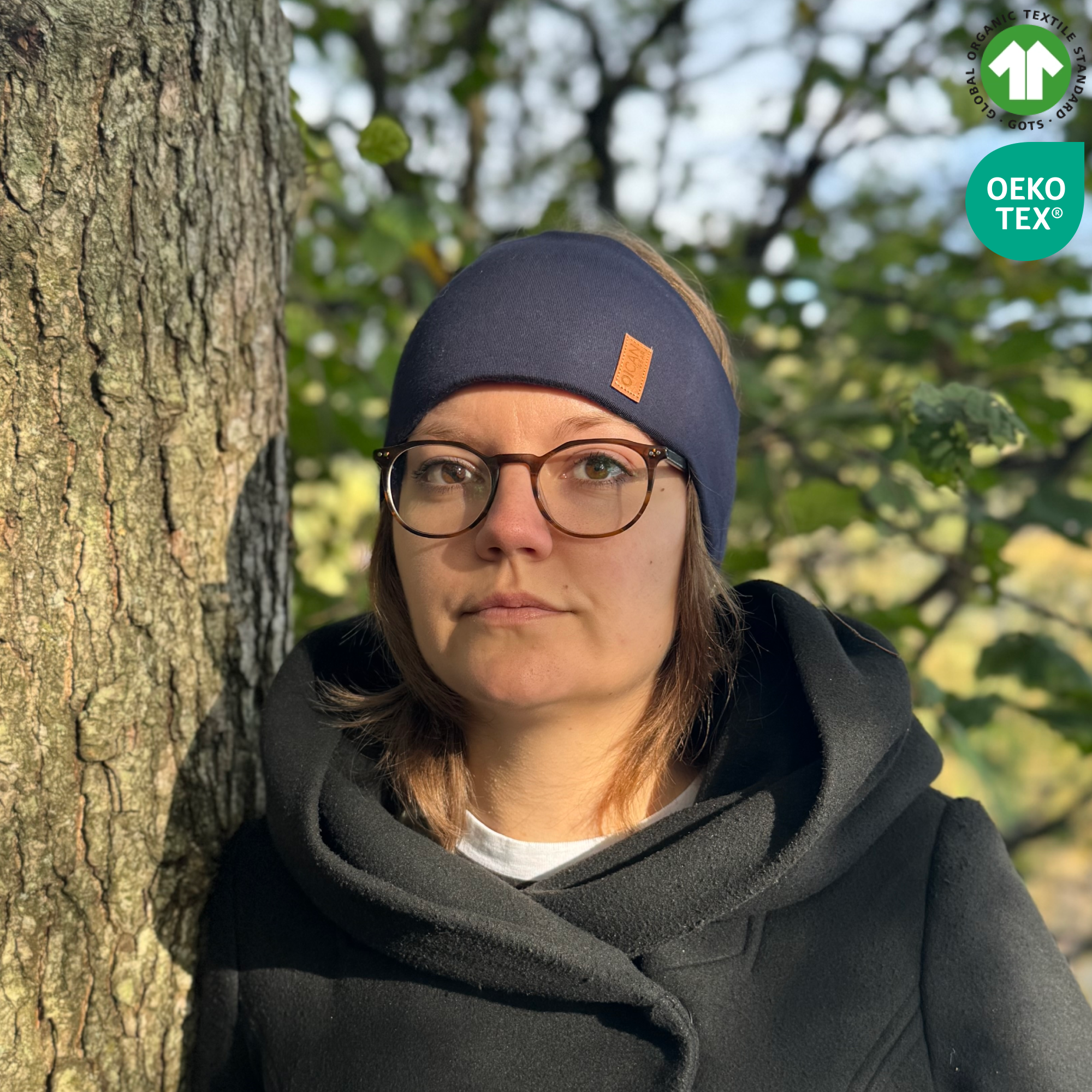 En tjej bär Navy Pannband från OICAN i skogen