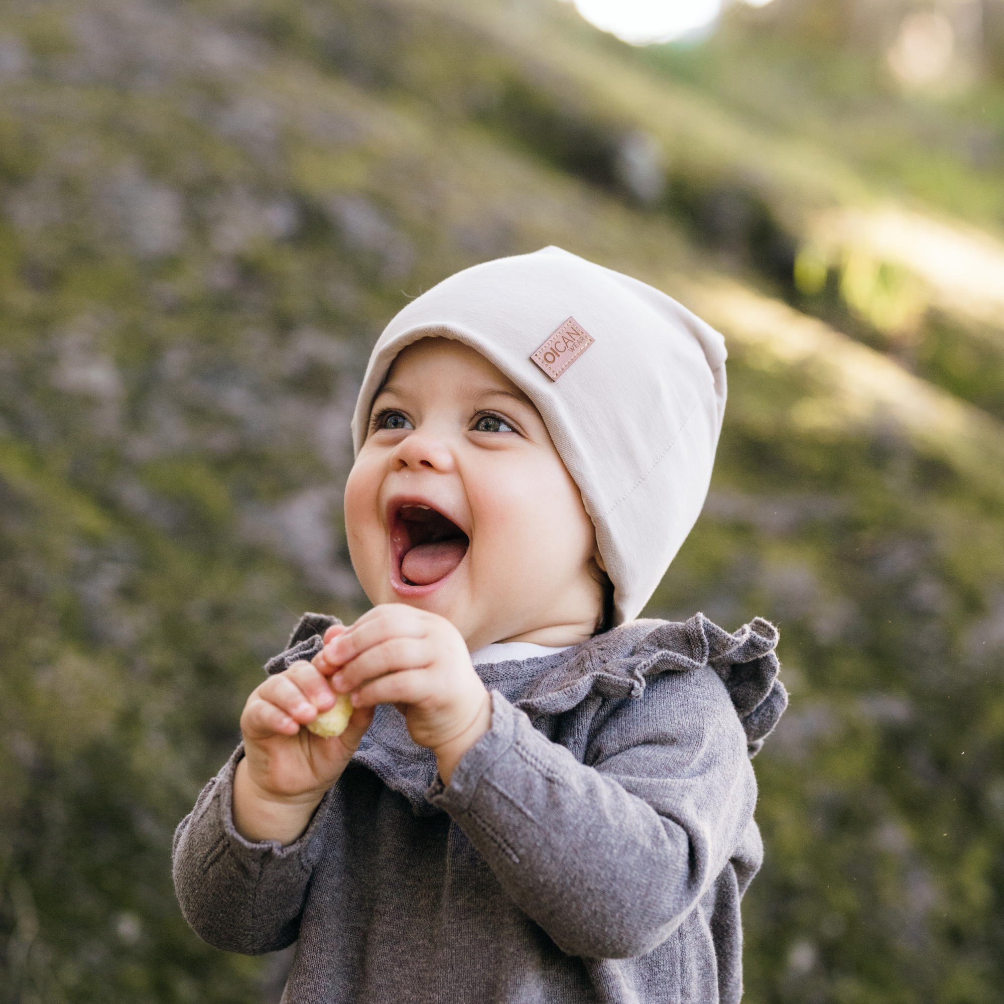 Flicka med beige Safehat i naturen, jätteglad