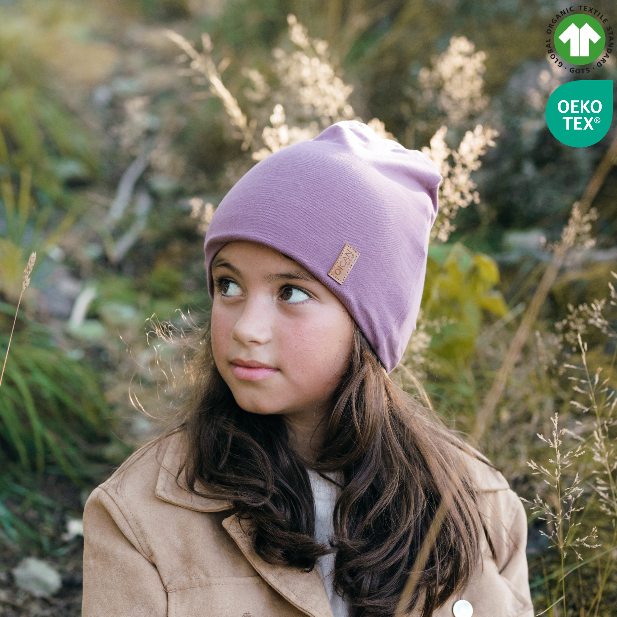 Flicka i naturen kollar åt sidan med en lila safehat på huvudet