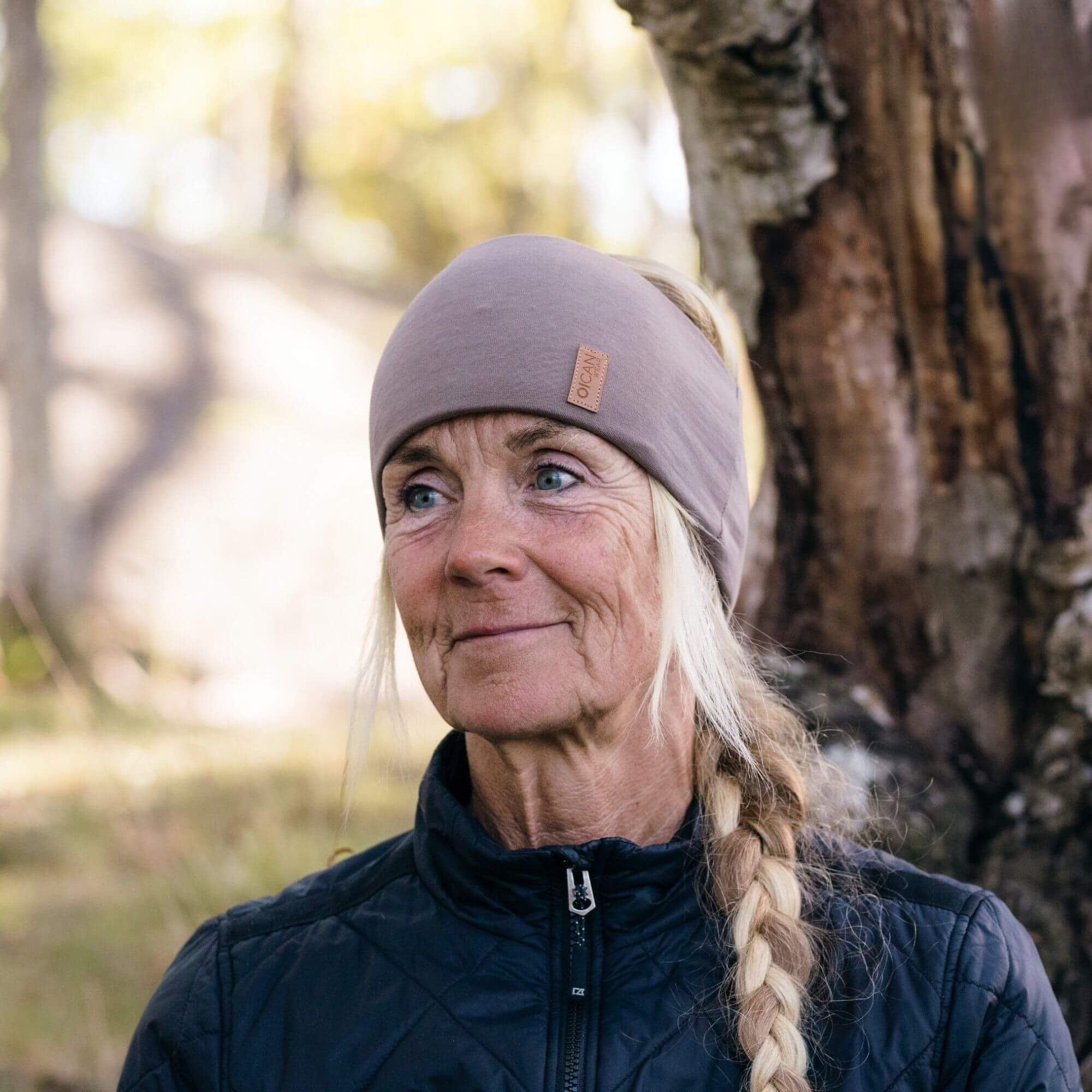 Dam bär taupe pannband från OICAN i naturen, bilden tagen från sidan