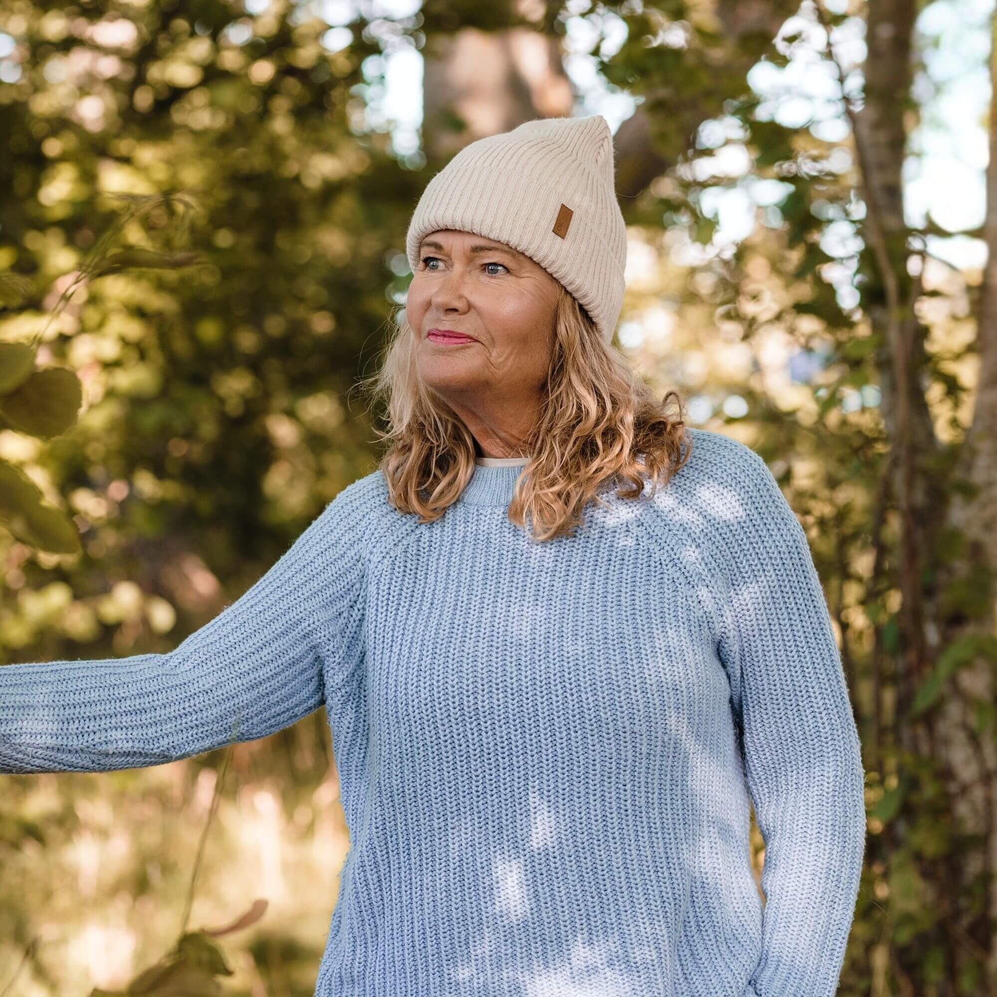 Dam bär Ivory SafeHat med blå stickad tröja i skogen